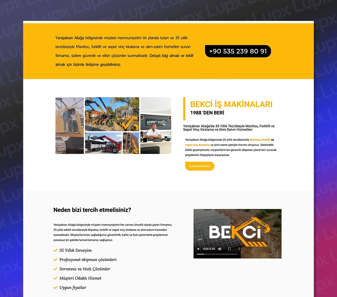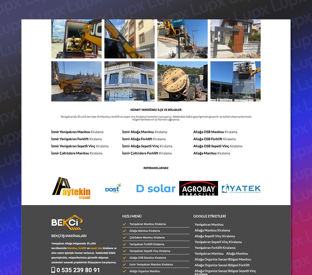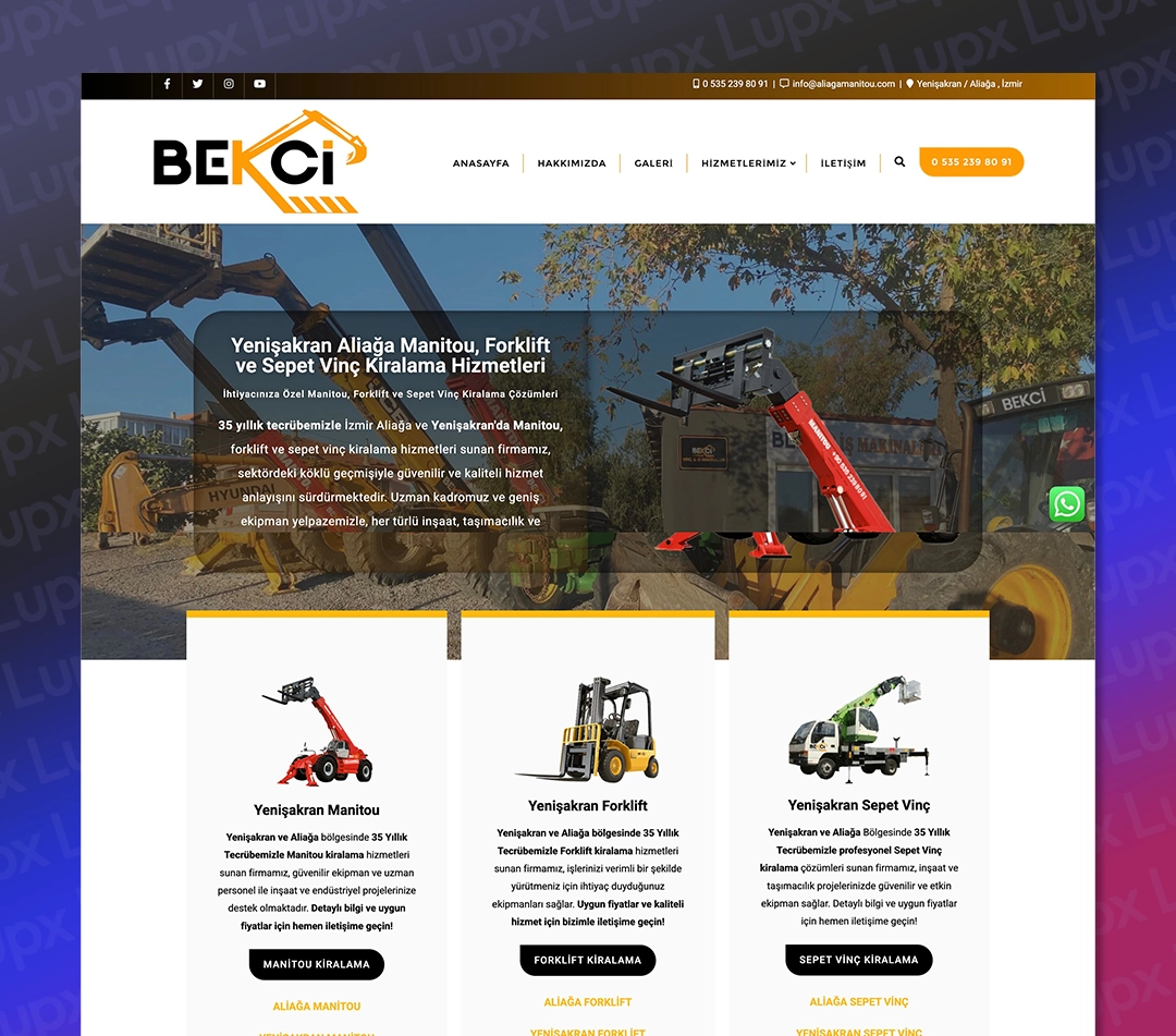 Bu projede, 35 yıllık tecrübeye sahip firmamız için, İzmir’in Yenişakran/Aliağa bölgesinde Manitou, forklift ve sepet vinç kiralama hizmetlerine yönelik etkileyici ve işlevsel bir web sitesi tasarladık. Amacımız, markanın sektöründeki köklü geçmişini ve güvenilir hizmet anlayışını dijital platforma en iyi şekilde yansıtmak ve bölgesel aramalarda Google’da üst sıralara çıkarak potansiyel müşterilere ulaşmaktı.