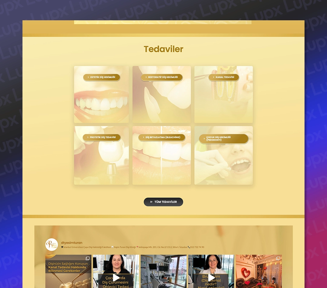 Lupx Dijital olarak, Dt. Yeşim Turan’ın diş kliniği hizmetlerini dijital dünyaya taşıma amacıyla modern, kullanıcı dostu ve SEO uyumlu bir web sitesi tasarladık. Projede, hasta deneyimini artırmak ve dijital erişilebilirliği maksimize etmek için online randevu sistemi, detaylı tedavi bilgileri, blog ve iletişim formları gibi işlevsel özellikleri entegre ettik.